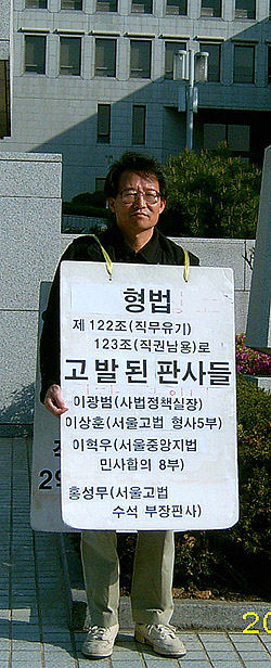 “1인시위 일지를 12월 말 경부터 쓰기 시작했다. 오다가다 만난 사람들 중 기막힌 사연의 사람들이 너무 많았다. 특히 1인 시위자들의 억울한 사연을 들어보면, 위조 위증 같은 건이 많은데, 판사들이 위조 위증에 대해 관대한 처분하는데 기인한다. 유전무죄 무전유죄라는 말이 맞는 말이다. 운이 없어 걸리면 벌금 200만 원 정도 내면 되니까 돈 있는 사람들이 그걸 왜 안 하겠는가. 돈 주고 사람을 사서라도 위증을 시킨다. 그에 따른 피해자들이 억울해서 1인시위를 한다. 법정에서 위증한다고 따져봤자 소용이 없는 것 같은데, 법정 내 모든 기록을 녹음하든가 하는 게 의무화되어야 할 것이다. 그러면 아마 우리 나라 재판 1/3은 없어질 것이다.”