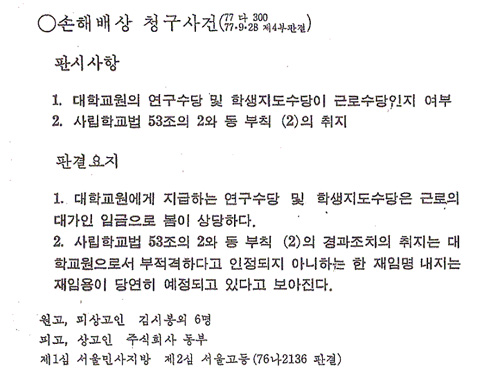 실제로 대법원 인터넷 홈페이지에는 지금도 77년 판례의 사립학교법 해석 관련 판시사항2, 판결요지2, 참조조문들이 삭제되어 있다.