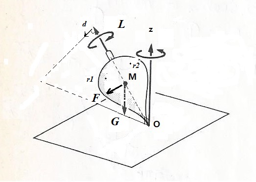 팽이의 각점에서의 힘은 vector $d$ 와 vector $L$로 이루어진 평면에 수직이고 그 힘을 모두 더하면, 아래 그림과 같이 무게중심에서 가해지는 $F$ 로 표현된다.