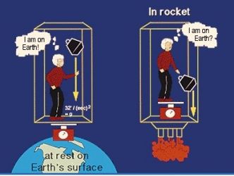 로켓안의 사람은, 로켓 뒤에 큰 질량의 지구가 있을 때와 가속 추진하는 로켓의 차이를 구별할 수 없다는 사실로 부터(아래 그림1), 중력은 가속도의 로켓에 같은 효과를 준다는 결론에 도달했다.