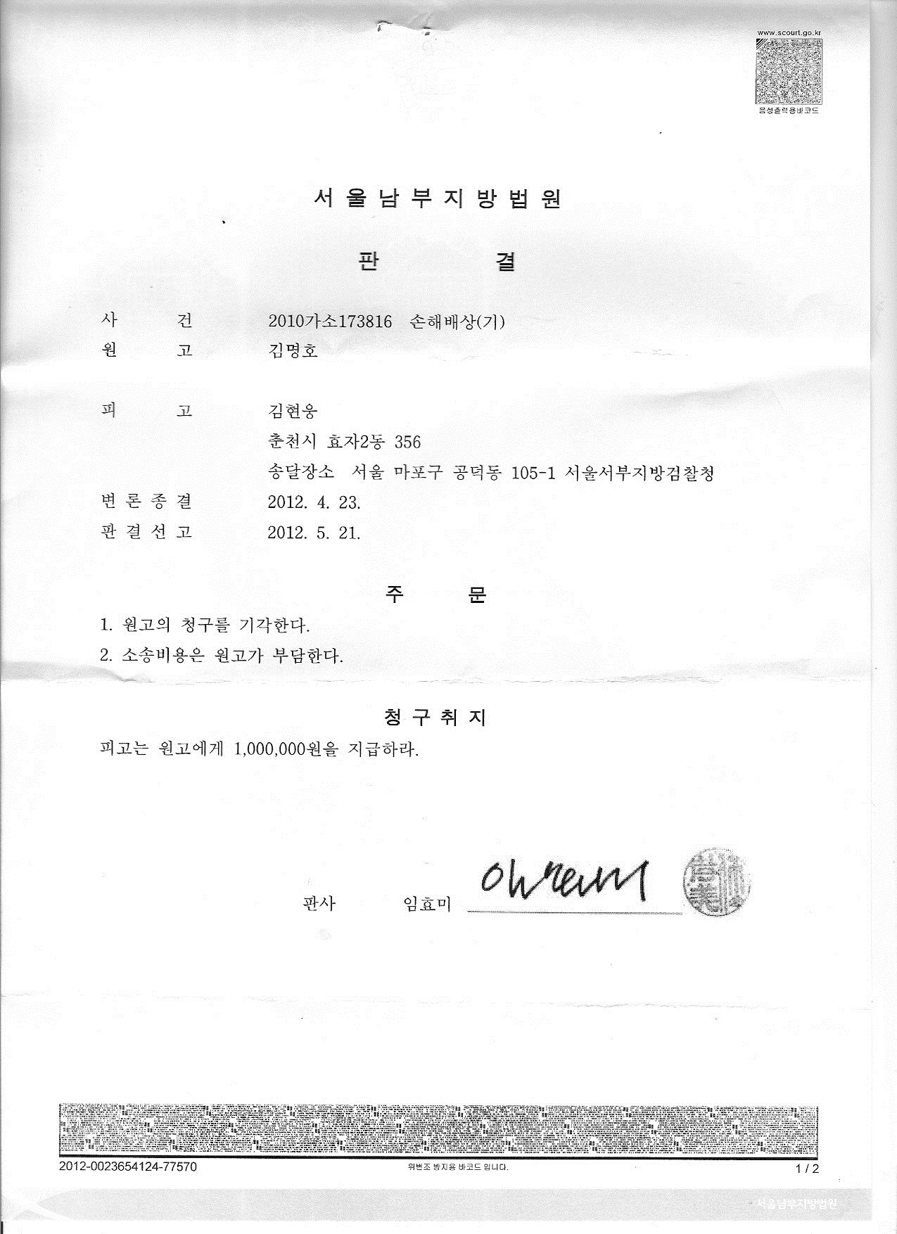 [2012.5.21] 판결선고: 원고패