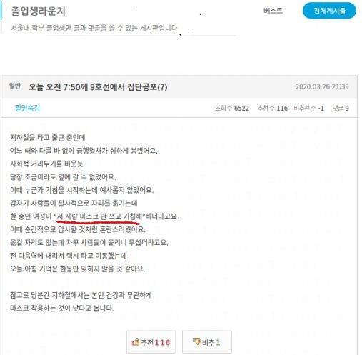 마스크 쓰는 것이 안 하는 것보다 다만 몇 %라도 효과야 있겠지만, 마스크가 절대 만능인 것처럼 착각하는 거하며... 코로나 감염되면 당장 죽을 것처럼 오두방정 떠는 인간들 정신상태가 문제라는 것.(* 이런 정신상태가 전체주의 파시즘 원인)