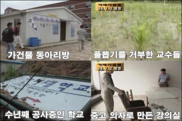 운동장 풀을 교수들에게 뽑으라 강요하기도 했는데, 교수들이 거부하자 학교 운동장은 잡초로 무성했습니다. 물이 새는 건물은 기본이고 대학의 기본인 도서관조차 수년째 공사만 하고 있습니다.