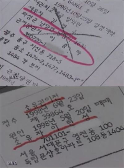 ▲학교 등록금으로 구입한 땅을 재단명의가 아닌 이홍하 개인과 아들 명의로 바꾼 증거자료. 출처:MBC 뉴스캡쳐,