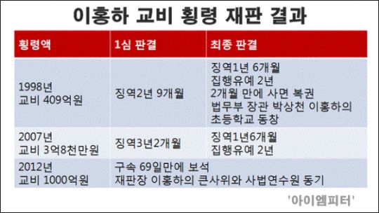 이홍하는 1998년 교비 409억원 횡령혐의로 1심에서 징역 2년 9개월을 선고 받았지만, 최종 판결에서는 징역 1년 6개월에 집행유예 2년을 받아 풀려났습니다. 이마저도 2개월 만에 사면복권됐는데, 당시 법무부 장관 박상천은 이홍하의 초등학교 동창이었습니다.