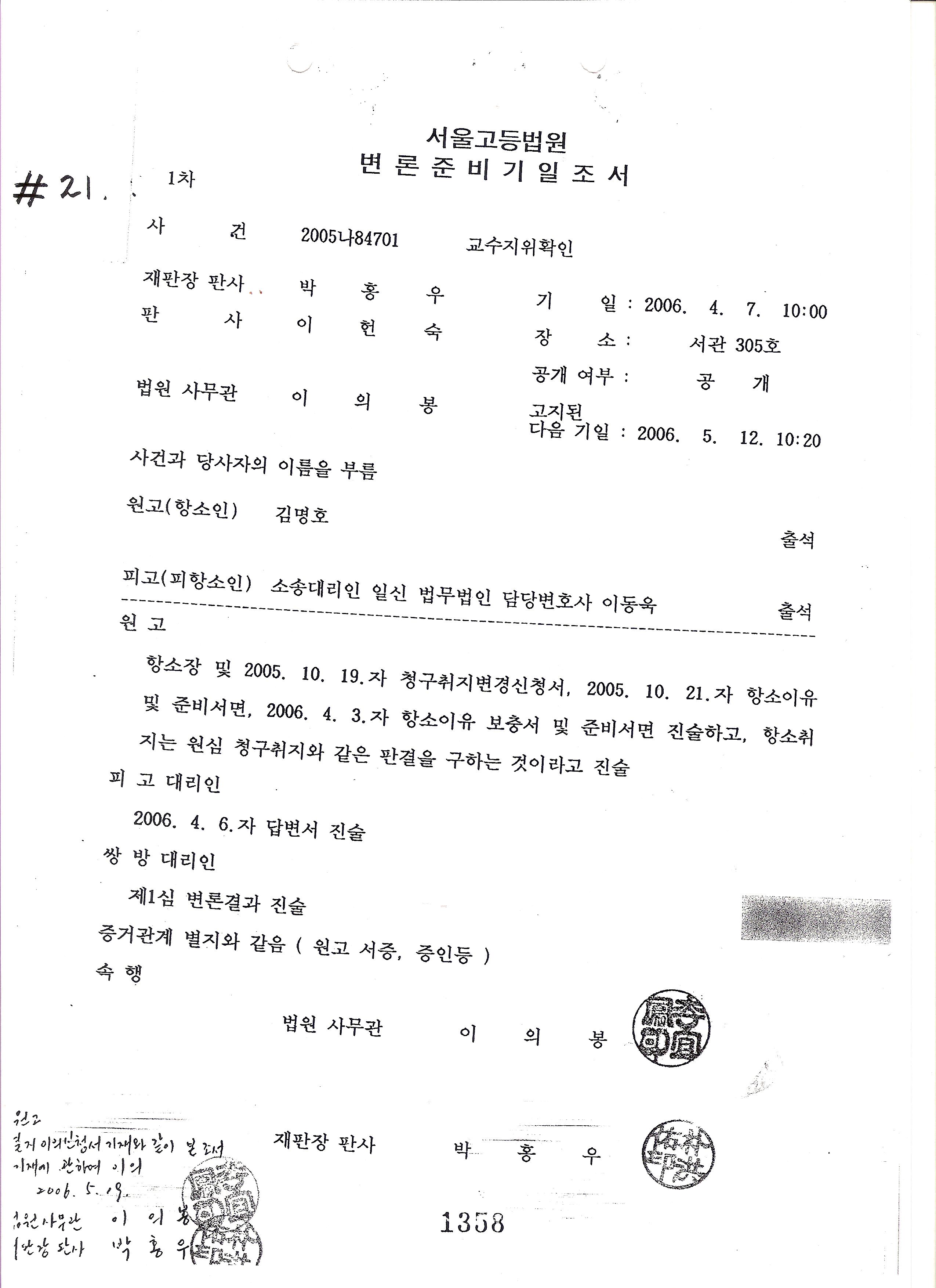 위 당사자간 교수지위확인 사건의 변론준비기일조서 관련하여,