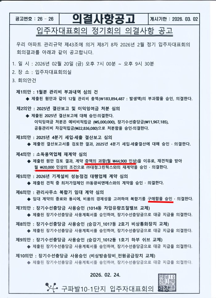 2.2일 교체한 후 2.20일 입주자 대표회의에서 비교 견적 최저가라 사기치며 수의계약 의결