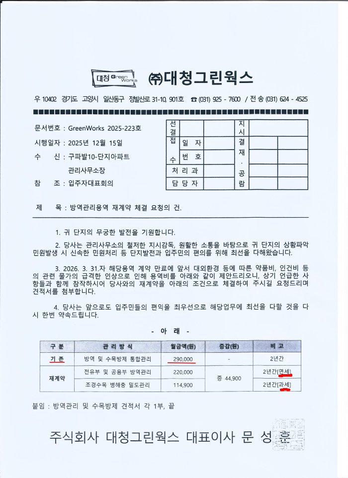 지난 2.20일 입주자 대표회의에, 대청그린웍스의 기존계약(방역관리+수목방제) 재계약 의결주문하면서 방역관리와 수목방제를 "분할" 계약하겠다며 임상현이 제출한 [안건4](자료1, 자료2)에 의하면