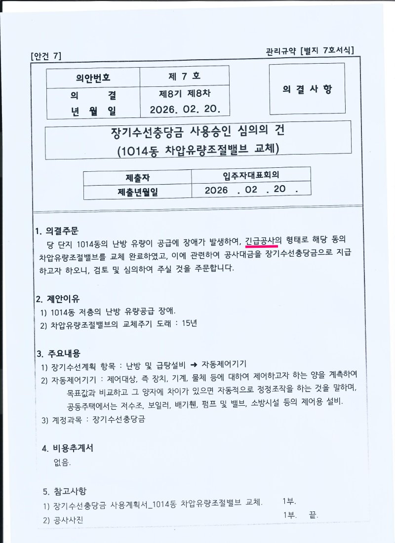 견적서는 2026.1.14 받았음에도, 긴급공사라면서 1.22일 입주자 대표회의에 의결 주문하지 아니하고