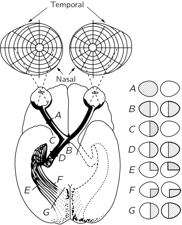 Figure 36–4 shows the connections of the eye to the part of the brain which is most directly concerned with the visual process. The optic nerve fibers run into a certain area just beyond $D$, called the lateral geniculate, whereupon they run out to a section of the brain called the visual cortex. Notice that some of the fibers from each eye are sent over to the other side of the brain, so the picture formed is incomplete. The optic nerves from the left side of the right eye run across the optic chiasma $B$, while the ones on the left side of the left eye come around and go this same way. So the left side of the brain receives all the information which comes from the left side of the eyeball of each eye, i.e., on the right side of the visual field, while the right side of the brain sees the left side of the visual field. This is the manner in which the information from each of the two eyes is put together in order to tell how far away things are. This is the system of binocular vision.