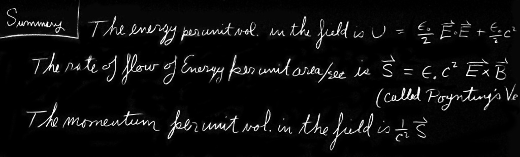 We should make one further remark about the energy formula. In the first place, the energy per unit volume in the field is very simple: It is the electrostatic energy plus the magnetic energy, if we write the electrostatic energy in terms of $E^2$ and the magnetic energy as $B^2$. We found two such expressions as possible expressions for the energy when we were doing static problems. We also found a number of other formulas for the energy in the electrostatic field, such as $\rho\phi$, which is equal to the integral of $\FLPE\cdot\FLPE$ in the electrostatic case. However, in an electrodynamic field the equality failed, and there was no obvious choice as to which was the right one. Now we know which is the right one. Similarly, we have found the formula for the magnetic energy that is correct in general. The right formula for the energy density of dynamic fields is Eq. (27.14).