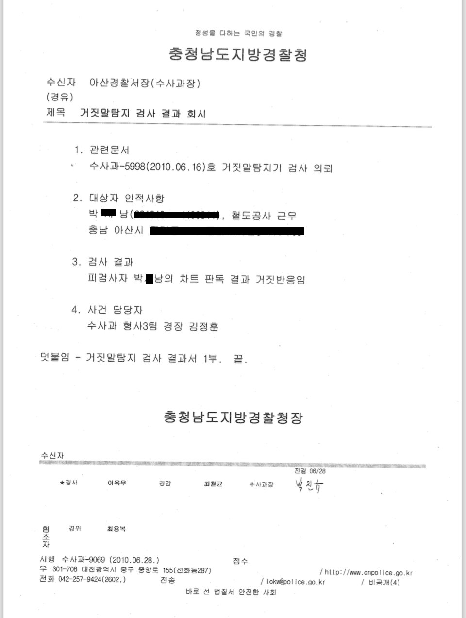 (1) 2010.6.28일 충남 경찰청 회시(신)에 의하면, 서두에 '피조사자 박O남의 차트 판독 결과 거짓 반응임' 기재하고는