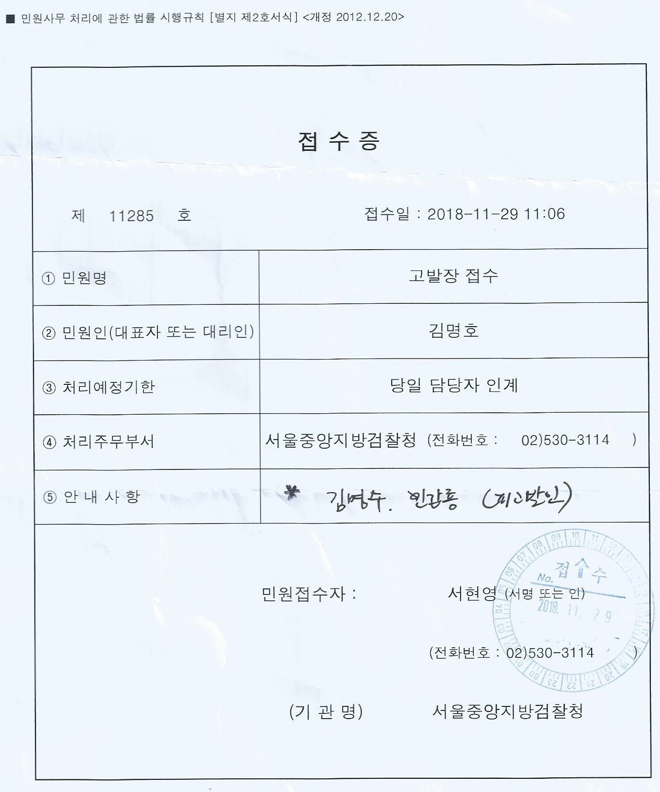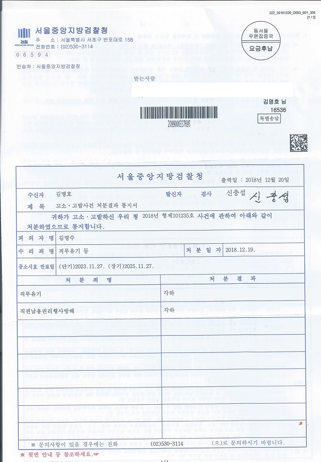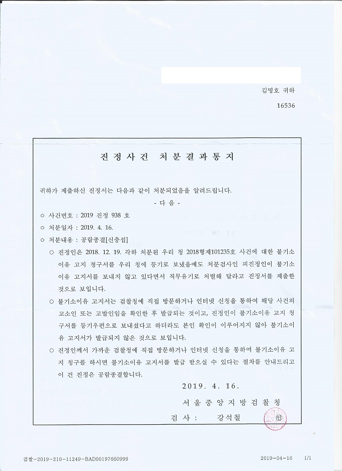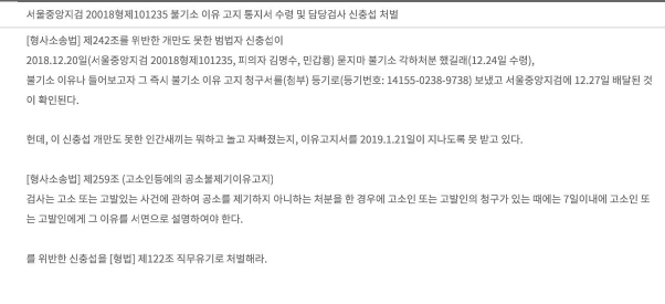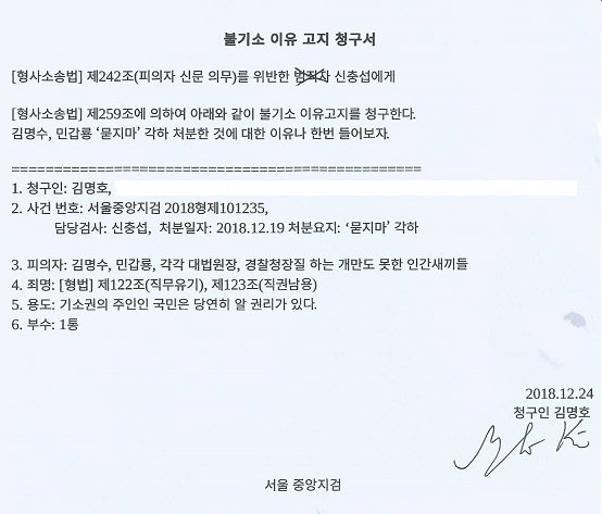 * 2018.12.24 각하통지 수령, 그리고 '불기소 이유 고지 청구서' 발송