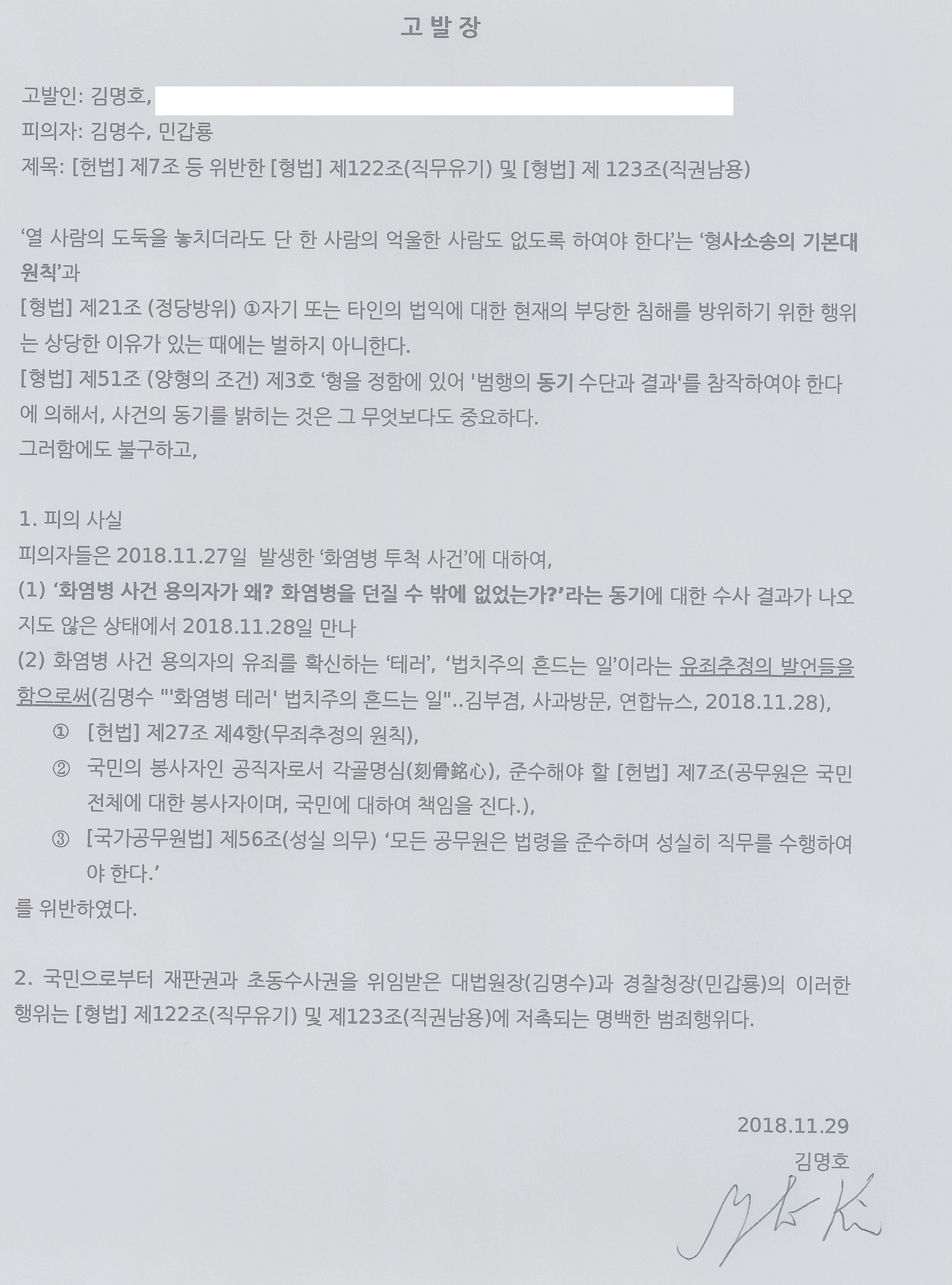 2. 국민으로부터 재판권과 초동수사권을 위임받은 대법원장(김명수)과 경찰청장(민갑룡)의 이러한 행위는 [형법] 제122조(직무유기) 및 제123조(직권남용)에 저촉되는 명백한 범죄행위다.