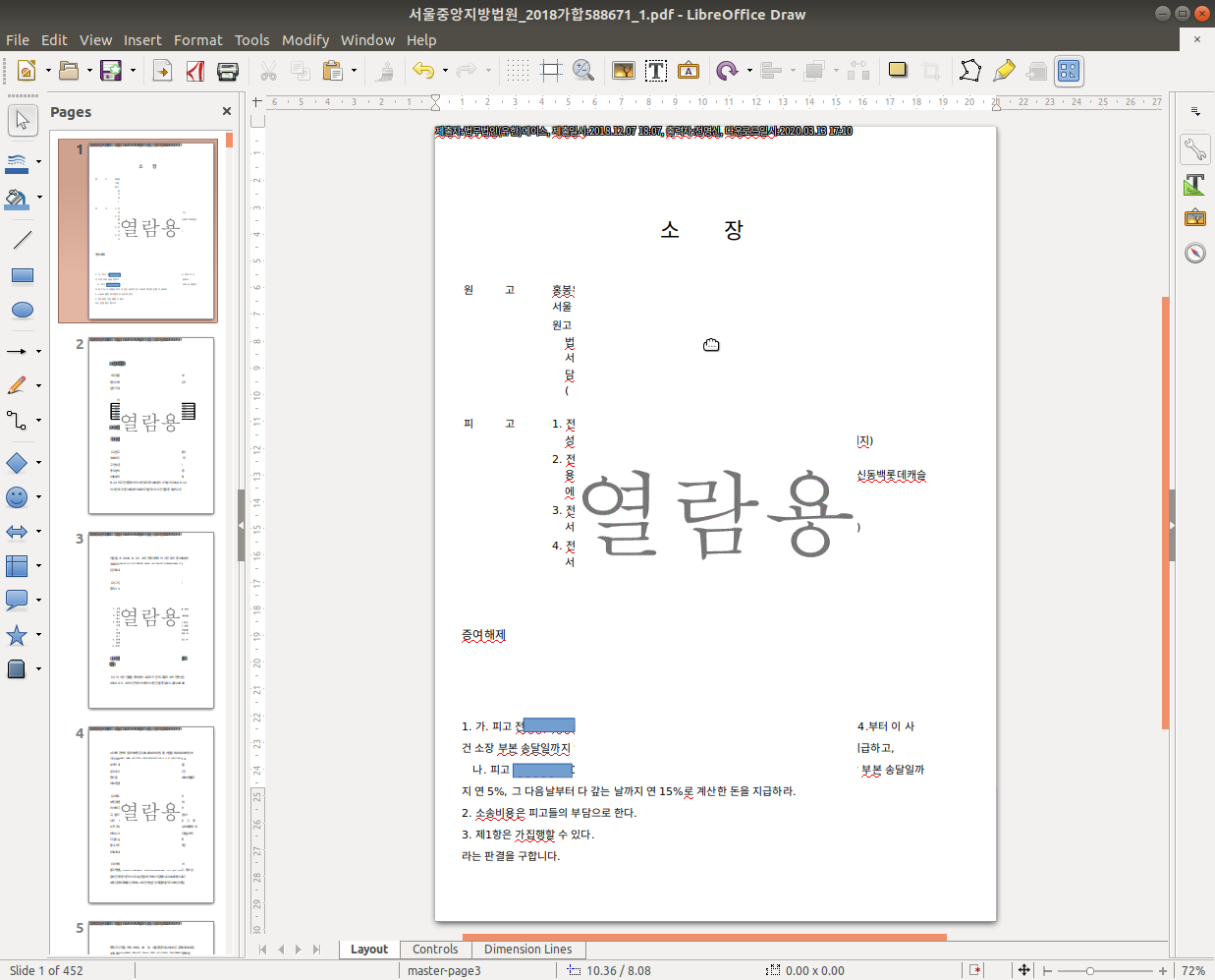 아주 재미있는 것은, 로고 없는 소장에서 피고들 이름과 주소를 삭제하기 위해 'LibreOffice Draw'라는 프로그램으로 열었더니