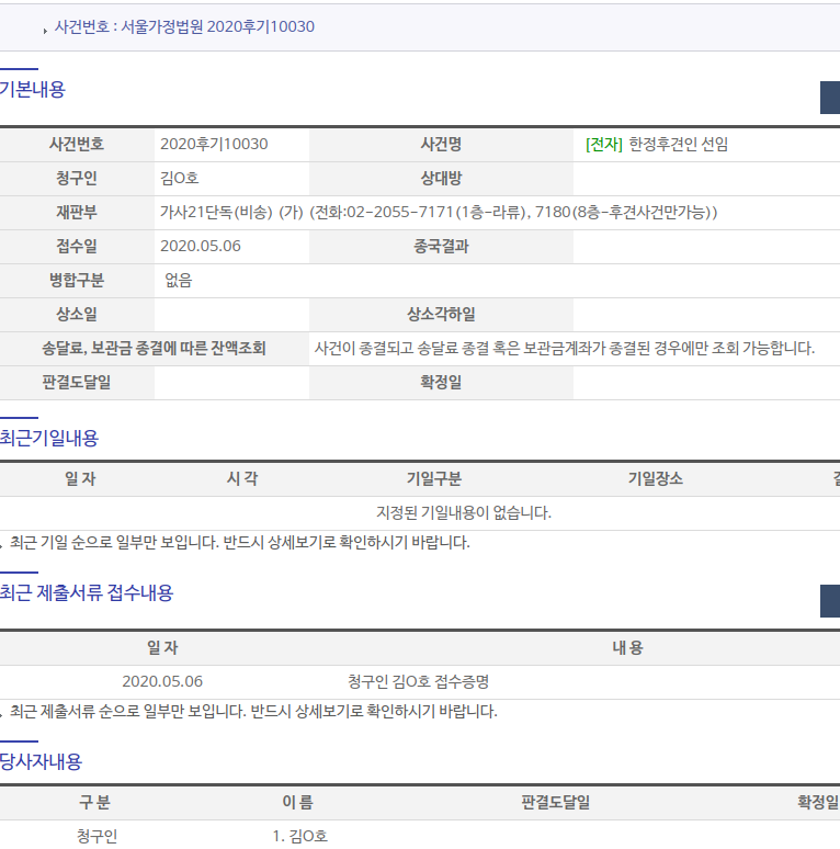 [2020.5.6] 홍봉유에 대한 한정후견인 선임 청구(서울가정법원 2020후기10030, 사건검색)