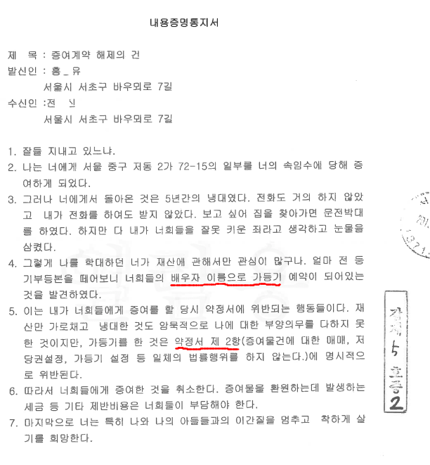 [2015.12] 홍봉유, '약정서 제2항' 위반이유로 증여취소 통보(내용 증명)