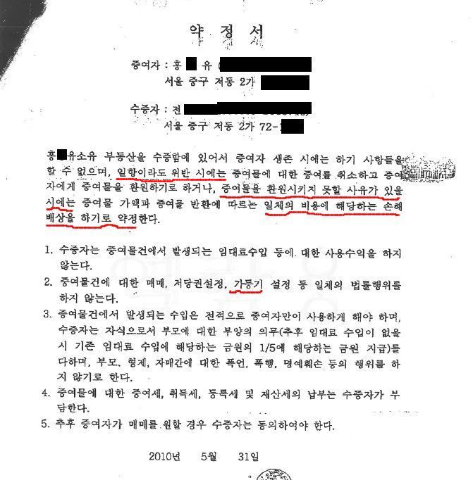 '홍봉유 소유 부동산을 수증함에 있어서 증여자 생존 시에는 하기 사항을들 할 수 없으며, 일항이라도 위반 시에는 증여물에 대한 증여를 취소하고 증여자에게 증여물을 환원하거나, 증여물을 환원시키지 못할 사유가 있을 시에는 증여물 가액과 증여물 반환에 따르는 일체의 비용에 해당하는 손해배상을 하기로 약정한다'를