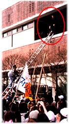 학생들은 결국 사다리를 타고 올라가야 했는데 행정동 직원들과 용역깡패들은 합세하여 사다리를 타고 올라가는 학생들을 발로 밀치고 옷걸이로 사다리를 흔들고 암튼 거의 살인 미수에 가까운 행동을 저질렀다. 무슨 행주대첩이냐.. 못올라오게 사다리 흔들고 발로 까고, 돌 던지게…