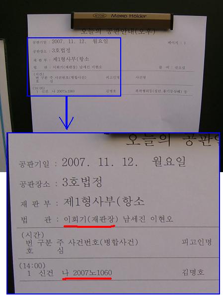 2007/11/12, 오후 2시, 동부지법 3호 법정에서 김명호 교수의 항소심, 첫 재판이 열렸다.