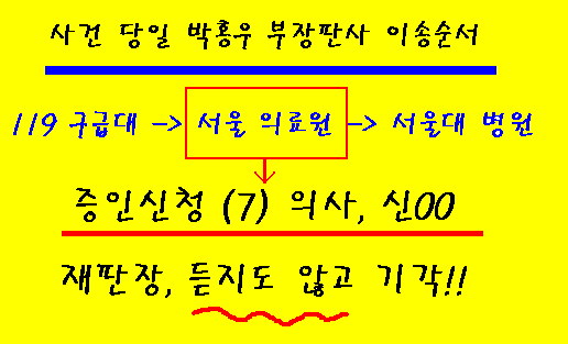 - (재판장) 피고인 주관 아닙니까? *** 증인 신청 부분에서... (검찰 측이) 박홍우의 상처에 관해서 (서울대학교  외과의사) 박규주 증인을 다시 증인신청 했고..