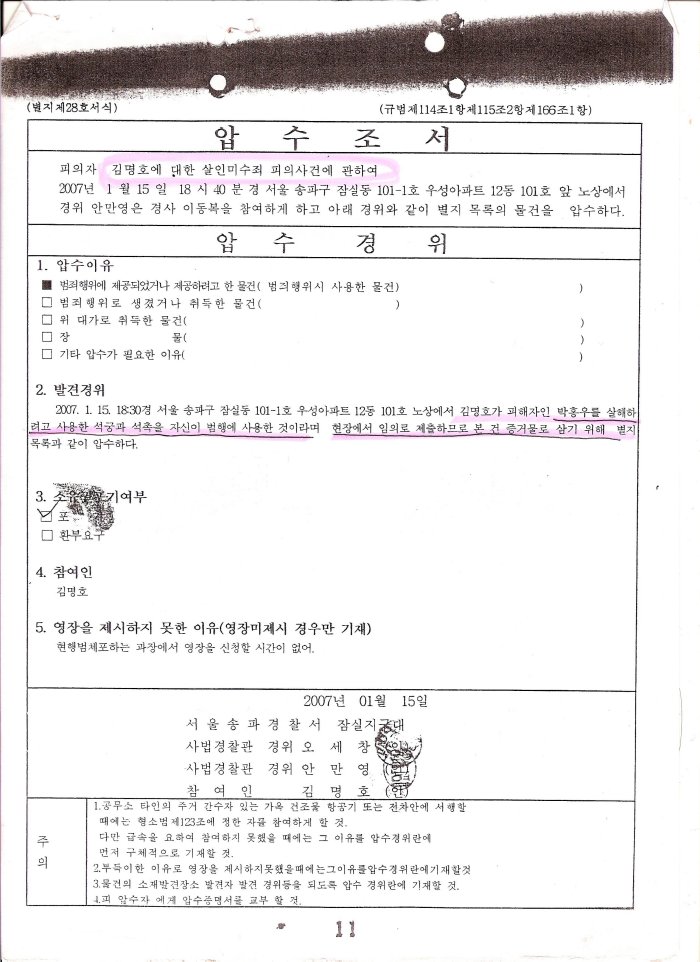 화살을 수거해간 사람이 누구인지와 아까 홍성훈 증인이 말한 것처럼 옷가지를 누가, 언제, 어디서 수거해갔는지에 대해서 일단 송파경찰서에 사실조회 신청한 다음 거기에서