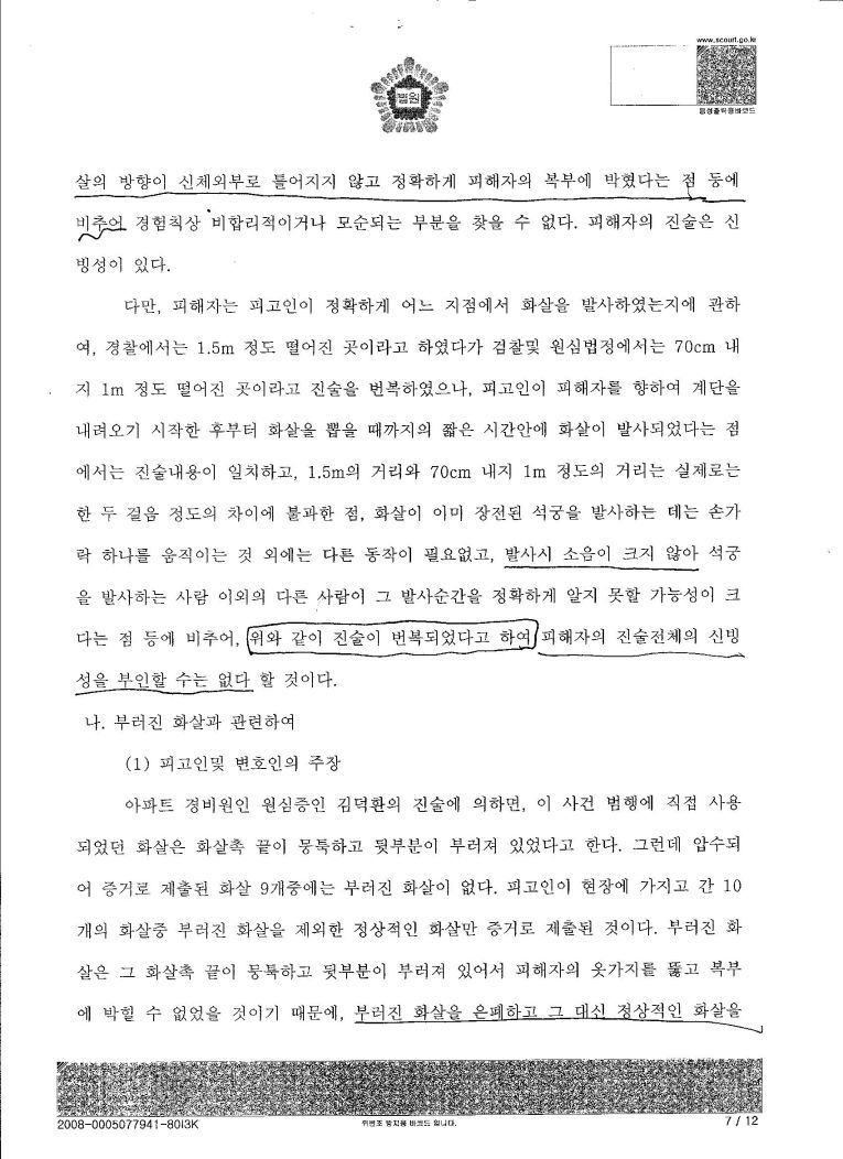 | 상해 및 증거 | 전치 5주(진단서와 갈비뼈 골절의 방사선 사진) | 전치 3주(증거없음, 자해 덮은 사진) |