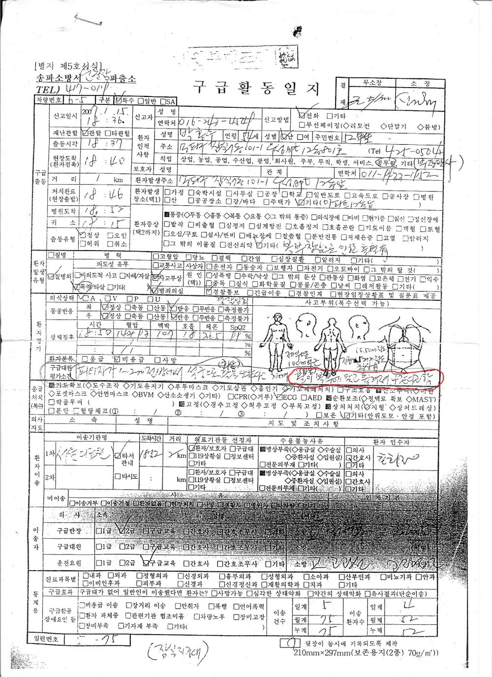 송파소방서 잠실운동장 파출소가 사건 당일인 작년 1월 15일 작성한