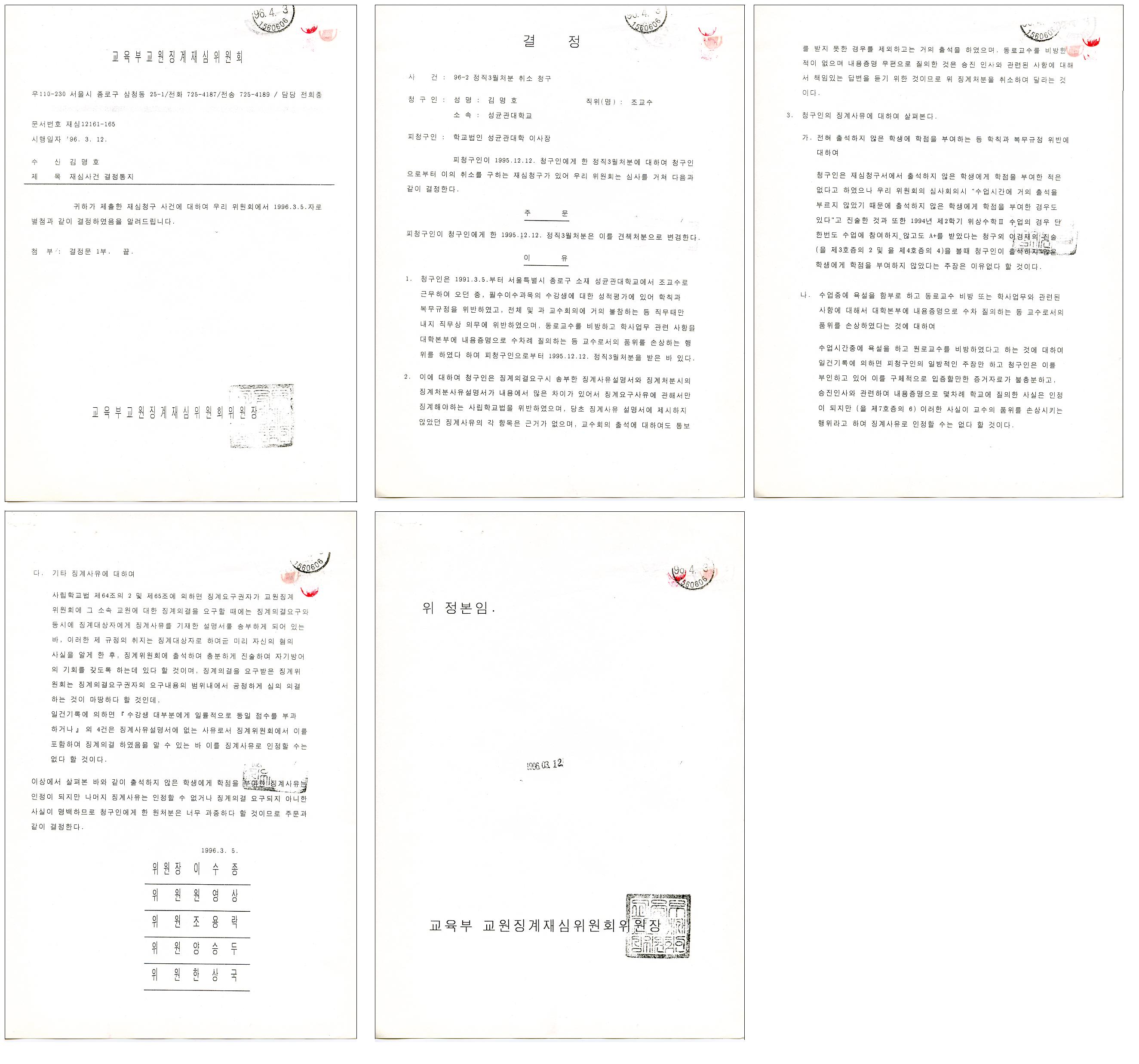 2. 그를 위한 필수 단계: 95년 4월 10월의 부교수 승진 2차례 탈락. 이유는 부교수 승진되면 임용기간이 10년으로 늘어남으로 인하여 96년 2월의 조교수 재임용 자체가 자동적으로 소멸되는 고로, 부교수 승진탈락은 필수.