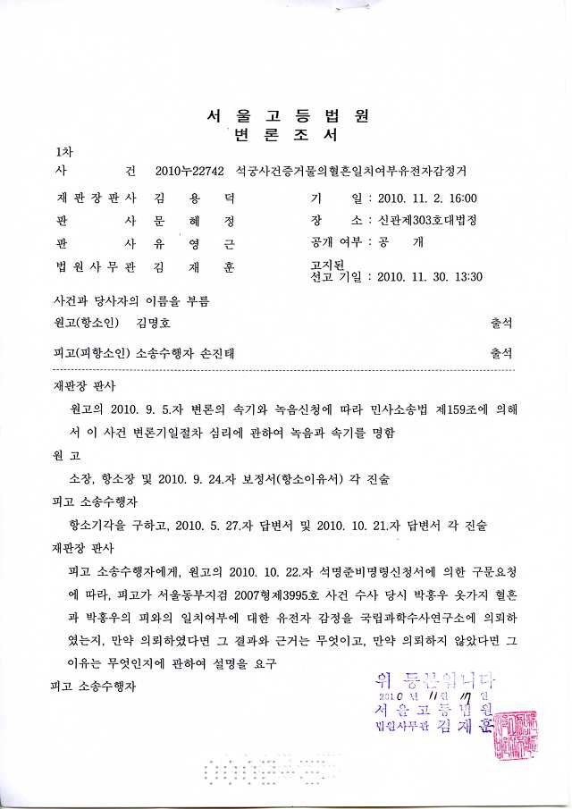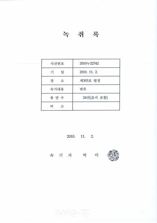 <서울고법 2010누22742> 2010. 11. 2일자 변론조서