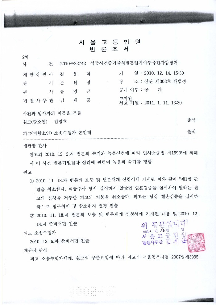 <서울고법 2010누22742> 2010. 12. 14 일자 변론조서