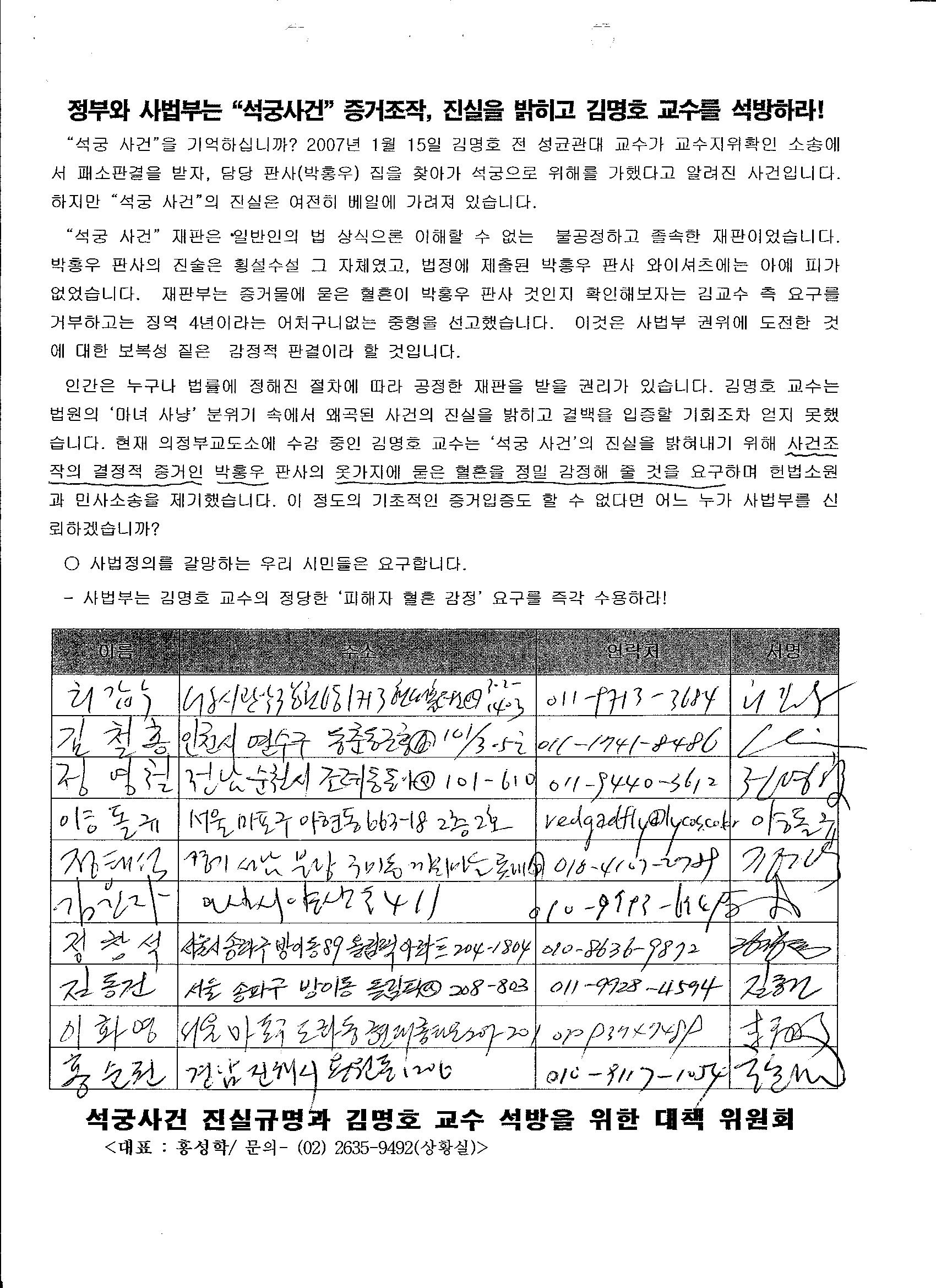 2009.06.16일 박홍우 옷가지 혈흔과 박홍우 피 일치 여부에 대한 혈흔 검증 촉구 의견 서명서를