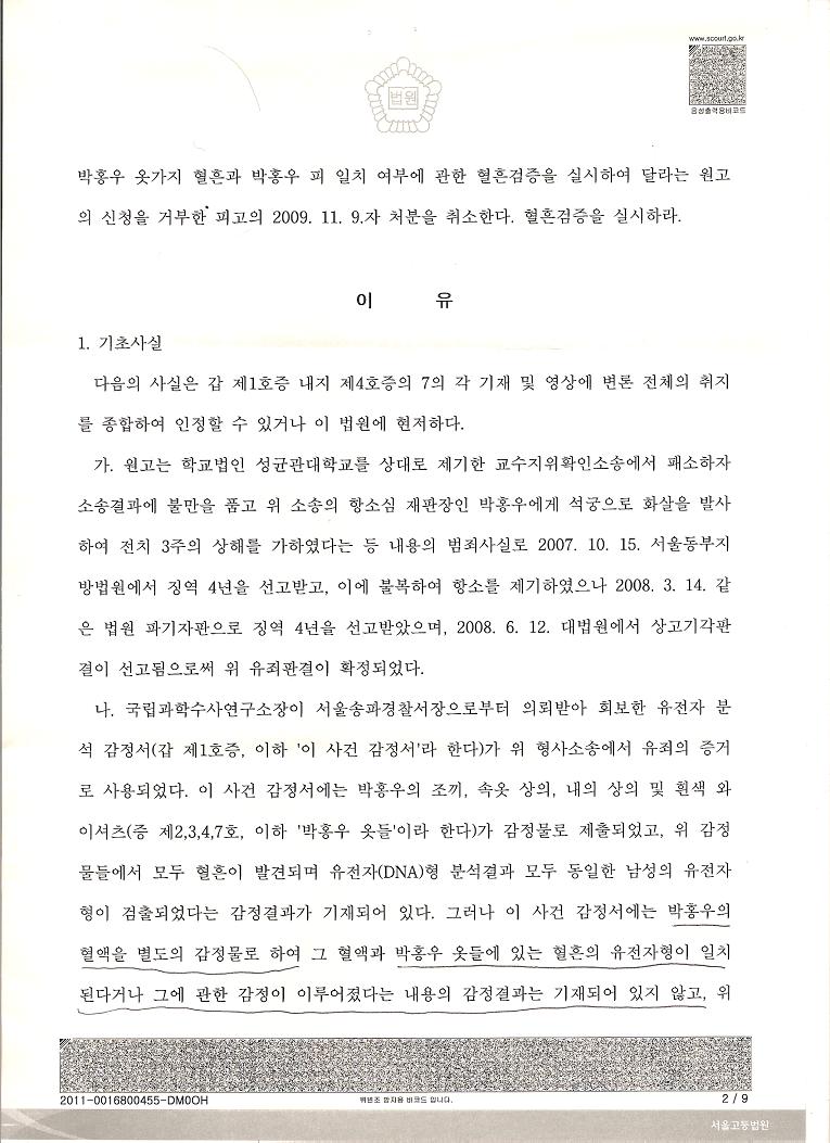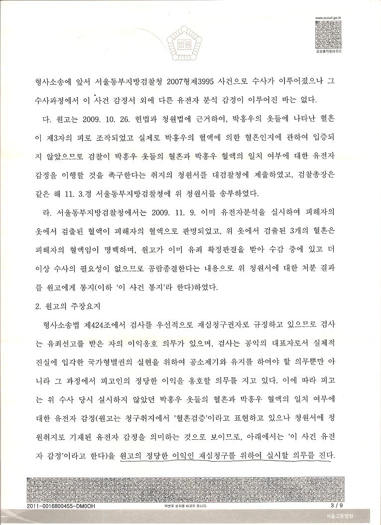 (* 박홍우 옷가지 혈흔과 박홍우 피에 대한 유전자 감정을 의도적으로 하지 않았다고 공식적으로 인정하고서도 여전히 주둥이로는