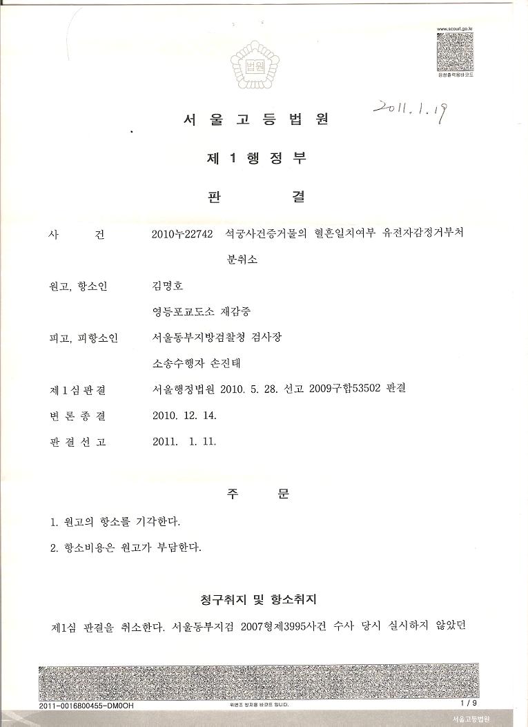 앞서 1심 재판부는 "'진정사건 처분결과를 종결하라'는 통지는 행정소송의 대상이 되는 행정처분이라 할 수 없고, 유전자감정을 실시하라는 적극적 행위를 할 의무의 이행을 구하는 소송은 현행 행정소송법상 허용되지 않으므로 부적법하다"며 각하 판결했다.
