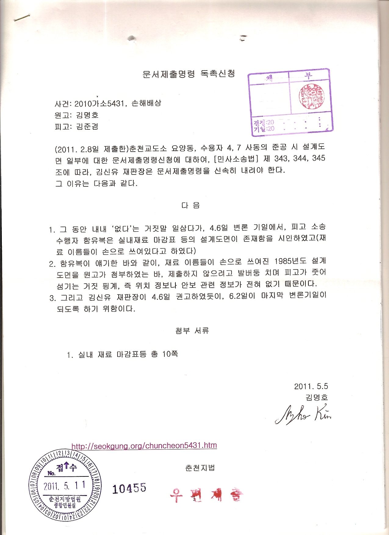 존재한다는 것이 확인되면, 소송시간 절약하기 위하여 그 즉시 문서제출명령 내려 다음기일 전에 설계도면 받아서 석면사용 여부 확인한 후, 바로 그 다음 기일에