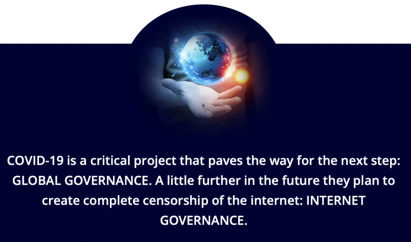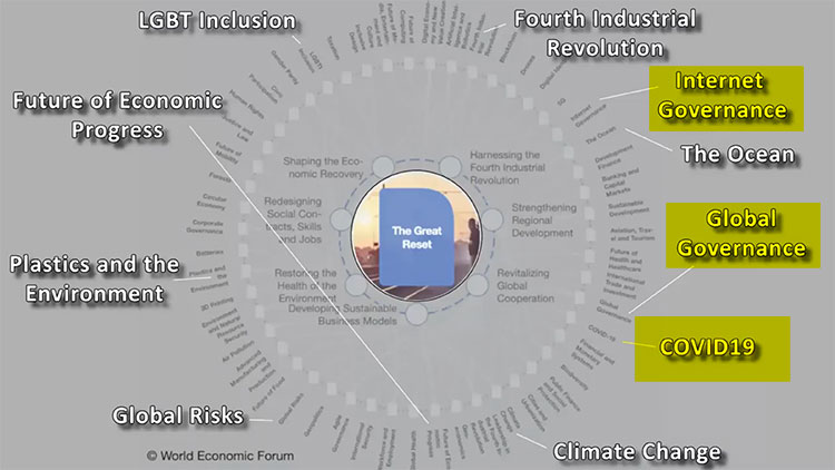 The Plan To Control The World You may have heard the word ‘globalists’ before, but for those who aren’t familiar with it: these are people around the world who plan to create one global government, so they can have total global control over health, religion, finances – everything. Main players in this are the United Nations , the World Economic Forum , the World Health Organization, the European Union, the International Monetary Fund, and many others. They recently came together in an event called DAVOS, where they expressed how the pandemic will be used to deploy their plans. Here are some of the statements they made: (18)‘Now is the historic moment in time, not only to fight the virus, but TO SHAPE THE SYSTEM. The pandemic represents a window of opportunity to RESET OUR WORLD. The world must act jointly and swiftly to REVAMP ALL ASPECTS of our societies and economies, from educational to social contacts and working conditions. EVERY COUNTRY, from the United States to China, must participate, and every industry, from oil and gas to tech, must be TRANSFORMED.’ – Klaus Schwab, Funder of the World Economic Forum A major leader of gobalism, is the World Economic Forum, founded by Klaus Schwab. He created a ‘spinning wheel’ with all their objectives. On it we can see the following three ‘projects’: Covid19 followed by Global Governance, and Internet Governance.