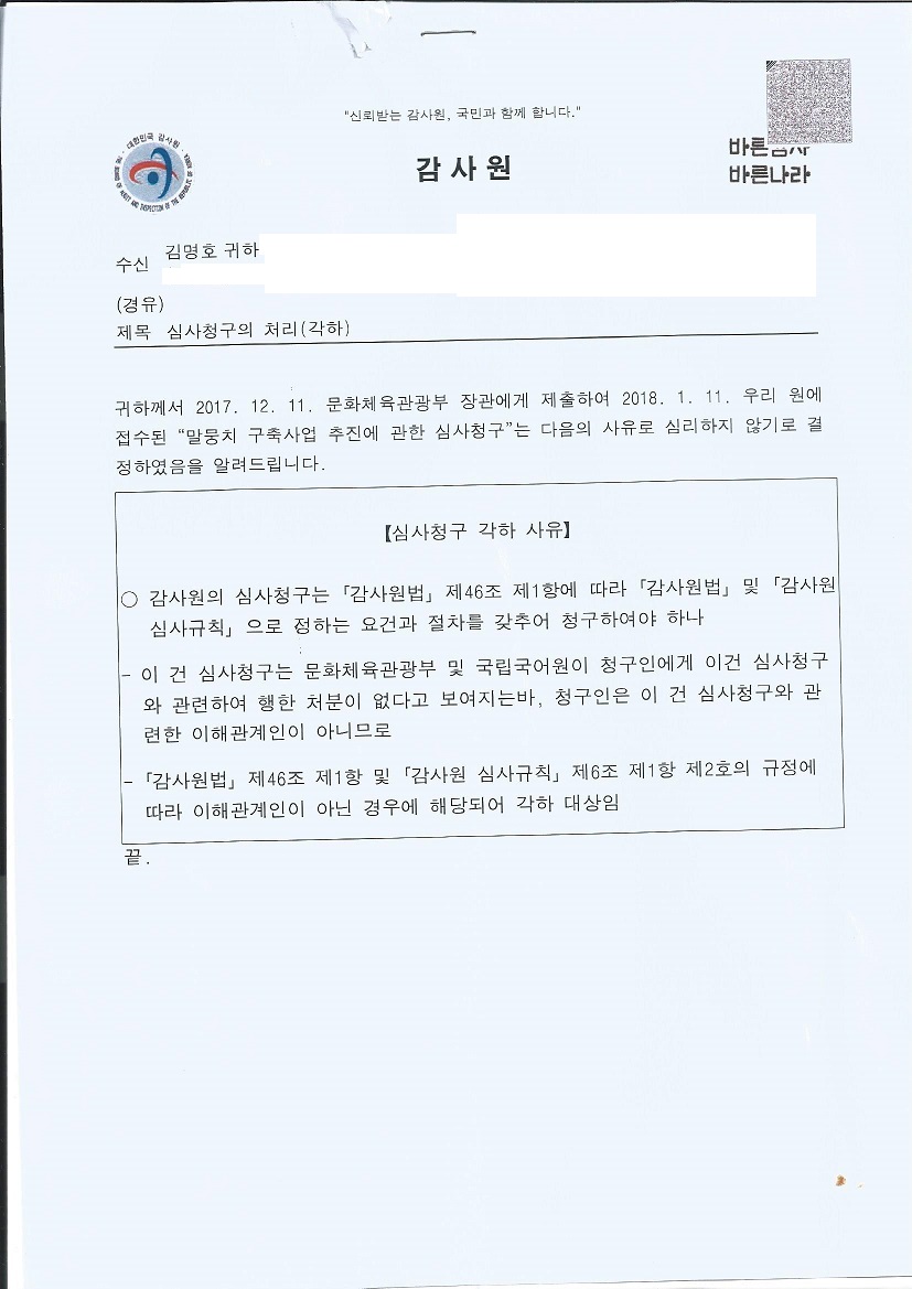 이 점을 깨닫지 못하고 감사 및 시정을 명령하지 않으면, 감사원도 문체부와 공범자가 되는 것.