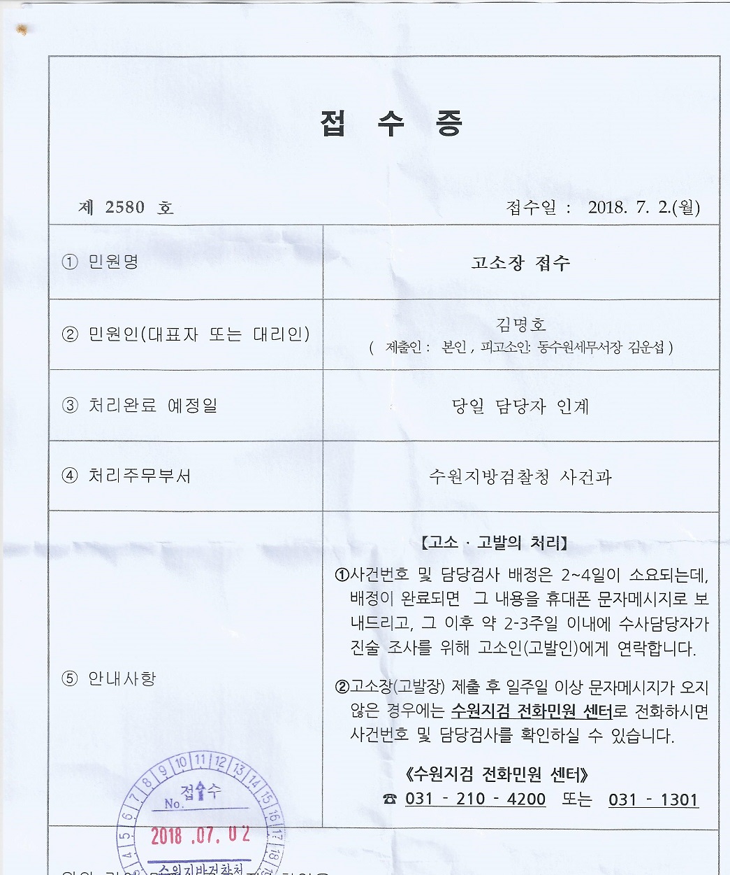[2018. 7.2] 동수원 세무서장 김운섭 고발