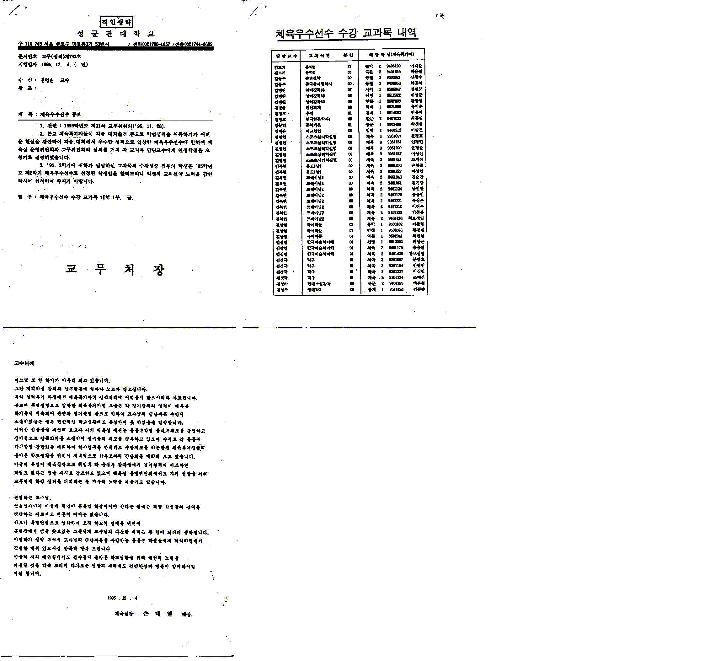 (나) 정직 3개월 징계의 부당성은, 교육부 소청심사위원회에서 '견책'으로 변경됨으로써 입증되었고, 그 견책 징계사유는 출석없이 학점을 부여하였다는 것이었습니다. 그런데, 어처구니 없게도 원고에게 정직 3월의 징계가 내려진 1995년 12월 12일로부터 불과 8일전에, (원고의 징계위원인, 갑 제20호증)교무처장 심윤종 교수가 보낸 공문에 의하면, 성대당국은 출석 및 학업에 충실치 않았던 학생들에게 인정 학점을 수여하기로 의결하였다는 사실입니다.(갑 제21호증)