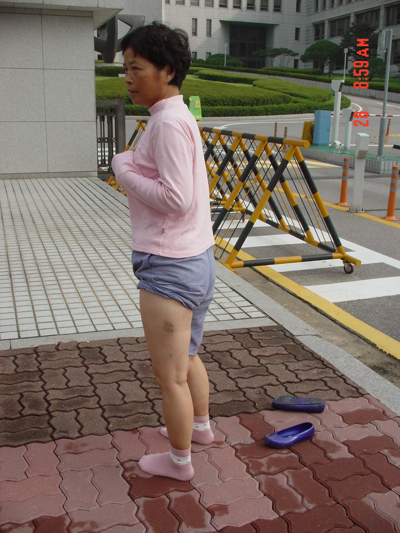 경비(또는 경찰)이 머리채 잡히고 발로 차였단다. 그때 생긴 멍든 상처라며 대법원장과 만나야 겠단다. |