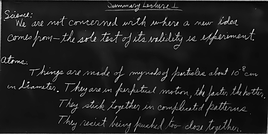 If, in some cataclysm, all of scientific knowledge were to be destroyed, and only one sentence passed on to the next generations of creatures, what statement would contain the most information in the fewest words? I believe it is the atomic hypothesis (or the atomic fact, or whatever you wish to call it) that all things are made of atoms—little particles that move around in perpetual motion, attracting each other when they are a little distance apart, but repelling upon being squeezed into one another. In that one sentence, you will see, there is an enormous amount of information about the world, if just a little imagination and thinking are applied.