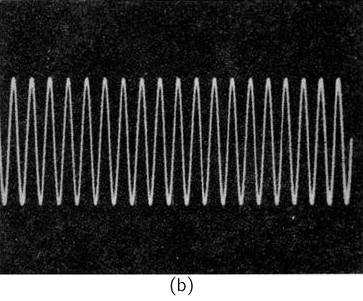We can make a series of such electronic oscillators, each with a period $10$ times shorter than the previous one. We may “calibrate” each oscillator against the next slower one by counting the number of swings it makes for one swing of the slower oscillator. When the period of oscillation of our clock is shorter than a fraction of a second, we cannot count the oscillations without the help of some device which extends our powers of observation. One such device is the electron-beam oscilloscope, which acts as a sort of microscope for short times. This device plots on a fluorescent screen a graph of electrical current (or voltage) versus time. By connecting the oscilloscope to two of our oscillators in sequence, so that it plots a graph first of the current in one of our oscillators and then of the current in the other, we get two graphs like those shown in Fig. 5–2. We can readily determine the number of periods of the faster oscillator in one period of the slower oscillator.