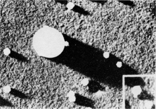 We need not stop, however, at what we can see. With an electron microscope, we can continue the process by making photographs on a still smaller scale, say down to $10^{-8}$ meter (Fig. 5–9). By indirect measurements—by a kind of triangulation on a microscopic scale—we can continue to measure to smaller and smaller scales. First, from an observation of the way light of short wavelength (x-radiation) is reflected from a pattern of marks of known separation, we determine the wavelength of the light vibrations. Then, from the pattern of the scattering of the same light from a crystal, we can determine the relative location of the atoms in the crystal, obtaining results which agree with the atomic spacings also determined by chemical means. We find in this way that atoms have a diameter of about $10^{-10}$ meter.