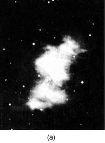 In the year 1054 the Chinese and Japanese civilizations were among the most advanced in the world; they were conscious of the external universe, and they recorded, most remarkably, an explosive bright star in that year. (It is amazing that none of the European monks, writing all the books of the middle ages, even bothered to write that a star exploded in the sky, but they did not.) Today we may take a picture of that star, and what we see is shown in Fig. 34–7. On the outside is a big mass of red filaments, which is produced by the atoms of the thin gas “ringing” at their natural frequencies; this makes a bright line spectrum with different frequencies in it. The red happens in this case to be due to nitrogen. On the other hand, in the central region is a mysterious, fuzzy patch of light in a continuous distribution of frequency, i.e., there are no special frequencies associated with particular atoms. Yet this is not dust “lit up” by nearby stars, which is one way by which one can get a continuous spectrum. We can see stars through it, so it is transparent, but it is emitting light.