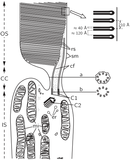 Let us now examine in more detail what happens in the rod cells. Figure 36–5 shows an electron micrograph of the middle of a rod cell (the rod cell keeps going up out of the field). There are layer after layer of plane structures, shown magnified at the right, which contain the substance rhodopsin (visual purple), the dye, or pigment, which produces the effects of vision in the rods. The rhodopsin, which is the pigment, is a big protein which contains a special group called retinene, which can be taken off the protein, and which is, undoubtedly, the main cause of the absorption of light. We do not understand the reason for the planes, but it is very likely that there is some reason for holding all the rhodopsin molecules parallel. The chemistry of the thing has been worked out to a large extent, but there might be some physics to it. It may be that all of the molecules are arranged in some kind of a row so that when one is excited an electron which is generated, say, may run all the way down to some place at the end to get the signal out, or something. This subject is very important, and has not been worked out. It is a field in which both biochemistry and solid state physics, or something like it, will ultimately be used.