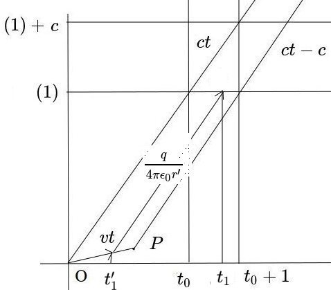 $P$는 $ct-c$와 $vt$의 교점으로 포텐셜이 도달할 수 있는 마지막 위치, $ct-c=vt$ => $t=\frac{c}{c-v}$