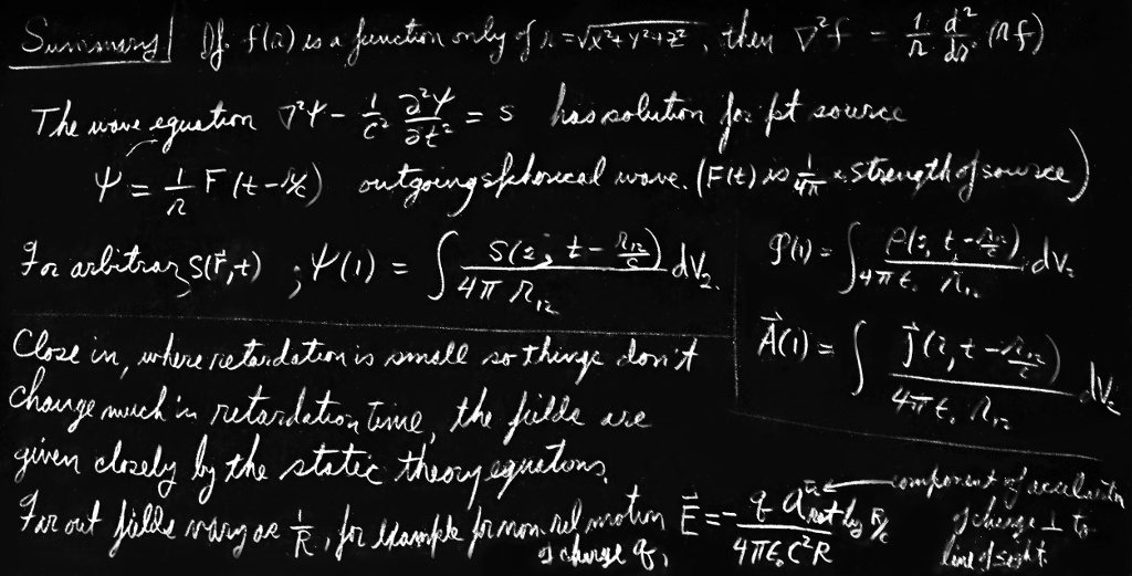 - If you have a lot of paper and time you can try to work it through yourself. We would, then, make two suggestions: First, don’t forget that the derivatives of $r'$ are complicated, since it is a function of $t'$. Second, don’t try to derive (21.1), but carry out all of the derivatives in it, and then compare what you get with the $\FLPE$ obtained from the potentials (21.33) and (21.34). ↩