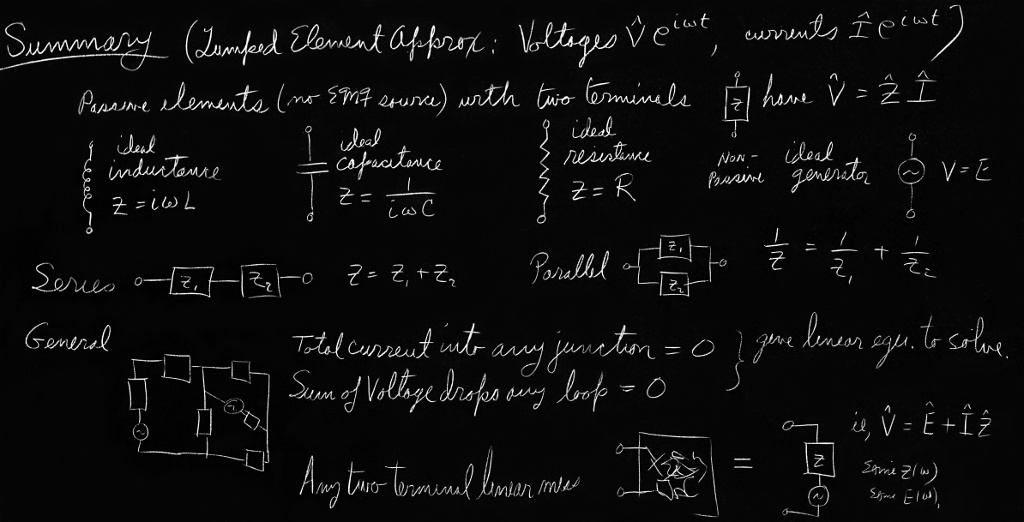 In the circuit elements we have described so far, the current and voltage are proportional to each other. If one is zero, so also is the other. We usually think in terms like these: An applied voltage is “responsible” for the current, or a current “gives rise to” a voltage across the terminals; so in a sense the elements “respond” to the “applied” external conditions. For this reason these elements are called passive elements. They can thus be contrasted with the active elements, such as the generators we will consider in the next section, which are the sources of the oscillating currents or voltages in a circuit.