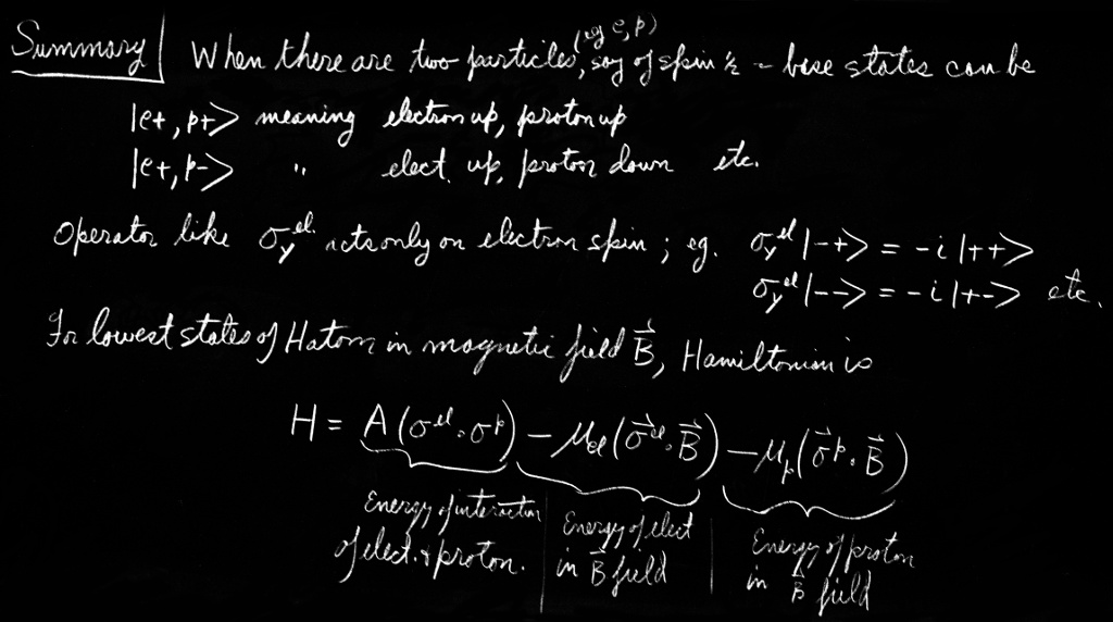 When there is more than one particle, the base states can be written in a similar way. For instance, if there were an electron and a proton in a more complicated situation than we are considering, the base states could be of the following kind: \begin{align*} |\,&\text{electron spin “up” with momentum $\FLPp_1$},\\[.5ex] &\text{proton spin “down” with momentum $\FLPp_2$}\rangle. \end{align*} And so on for other spin combinations. If there are more than two particles—same idea. So you see that to write down the possible base states is really very easy. The only problem is, what is the Hamiltonian?