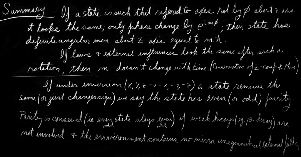 You see, therefore, the relation between the conservation laws and the symmetry of the world. Symmetry with respect to displacements in time implies the conservation of energy; symmetry with respect to position in $x$, $y$, or $z$ implies the conservation of that component of momentum. Symmetry with respect to rotations around the $x$-, $y$-, and $z$-axes implies the conservation of the $x$-, $y$-, and $z$-components of angular momentum. Symmetry with respect to reflection implies the conservation of parity. Symmetry with respect to the interchange of two electrons implies the conservation of something we don’t have a name for, and so on. Some of these principles have classical analogs and others do not. There are more conservation laws in quantum mechanics than are useful in classical mechanics—or, at least, than are usually made use of.